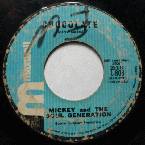 Records tend to show up in the most curious places, usually far away from their state of origin (but are distributed by labels in major cities all over the US). If one were to dig for records over here on the East Coast, let’s say New Jersey or New York, you’d find tons of records from NYC, Newark, NJ, and Philly that were used in juke boxes all over the Tri-State area. Record labels like Bell, Turbo, and All Platinum are labels that come to mind. You wouldn’t expect to find a record from Texas or Indiana without it being issued on a New York or Philadelphia label that had a distribution deal with said band. A few years ago, I was digging at the Spot early, and I had to be home by a certain time. On my way out, I managed to get a box of unsleeved 45’s for $20. There were hundreds of 45’s that looked like they were just tossed into this box without care, but I had a feeling that there would be some gold in there. I was right, as I found all kinds of records, but one that I had never got in the field: Mickey and the Soul Generation “Iron Leg” on Maxwell Records. Here’s a the flip side of that record: “Chocolate”.