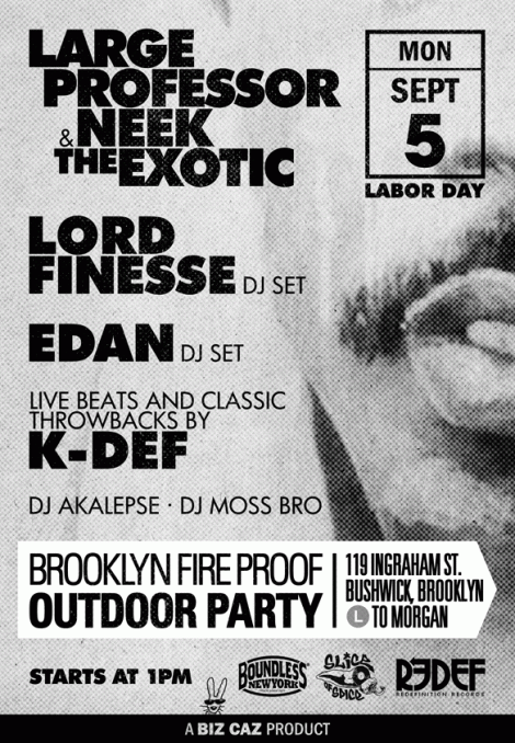 Looking for something to do this Labor Day? FMF has exactly what you’re looking for. My dude David Schrier has got another Labor Day spectacular party going on again. When I was living in Jersey I could never make these, but now that I am in BK, well I’m gonna have to get to them. These outdoor parties have been the hit of the last few Summers, and this one seems it may out do all the rest. Headlining are Large Professor and Neek the Exotic. For those of you unfamiliar, Large Pro (or Xtra P if you prefer), producer extraordinaire, member of Main Source (“Lookin’ Out the Front Door”, “Just Hangin’ Out”, etc.) was making beats for the likes of Eric. B and Rakim while y’all were in diapers. That’s just the start, how about Nas, Pete Rock, Mobb Deep? Should I go on? Neek the Exotic has been riding with the Xtra P for a minute, can I get the instrumental of this? Lord Finesse and Edan both are doing DJ sets. I’ve been seeing Edan all over NYC as of late, from the Hot Peas & Butta 3rd Year Anniversary to the NYC opening of the Tribe documentary at the Sunshine, plus this performance at Southpaw. Lord Finesse, well is Lord Finesse. If he’s DJing a set, let’s just say he’ll be Diggin’ In The Crates, knowhutimsayin’? K-Def, “one of the most wrongly slept on Hiphop producers of the 90’s” will be doing live beats and throwbacks as well. There will also be DJ sets from DJ Akalepse (one of BK’s best DJ’s IMHO, check him out in my man Eilon’s Dust and Grooves from 2010) and DJ Moss Bro. You may ask yourself, why should I go to some outdoor party when I could say, be at the beach? Let me answer it for you. You will not see this kind of talent all together in NYC outdoors in a long while. We have professors (literally) and educators of this music game teaching class, spinning records you will not hear anywhere else, while you sip cocktails and enjoy the end of the Summer party. Plus, there are exclusive vinyl giveaways from ReDef and Slice of Spice Records and clothing giveaways from Boundless NY. Think of this as a Public Service Announcement from your friendly neighborhood record slinger.