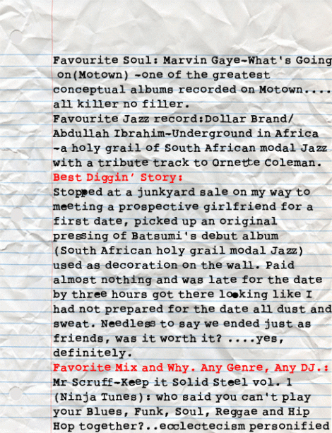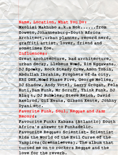 Mxolisi Makhubo a.k.a Nok is a DJ, collector, Graff Artist, and architect who resides in Soweto,Johannesburg-South Africa. His talent shows through his music and art, and I’m happy to showcase him this week in the Big Ups series. Keep Diggin’!