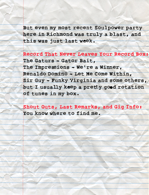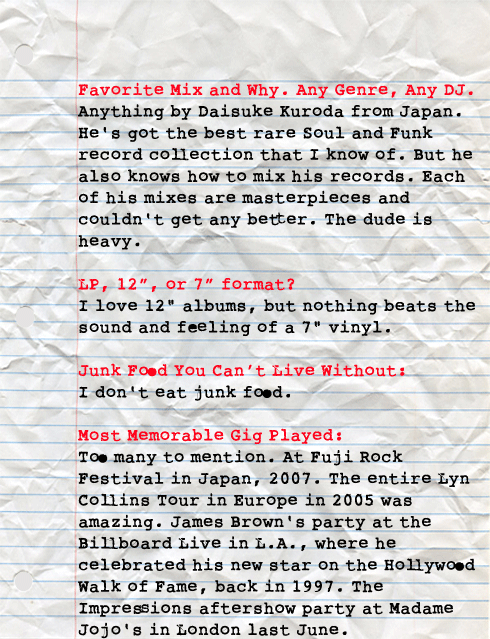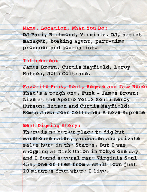 Richmond, VA via Germany, DJ Pari is an all around Funk and Soul machine. Touring with James Brown, making records with Marva Whitney, and DJing every corner of the world spreading the gospel of 45 music is all in a day’s work. Here’s another person making a difference doing what he loves. Big Ups.