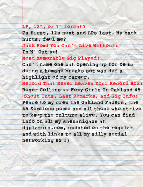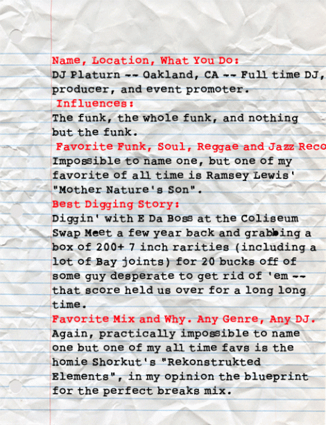This week’s Big Ups takes us to the Left Coast with DJ Platurn. The 45 Sessions and Oakland Faders DJ and producer has been rocking the Bay Area for more than a minute. It is our pleasure to have him in this installment of the Big Ups series.
