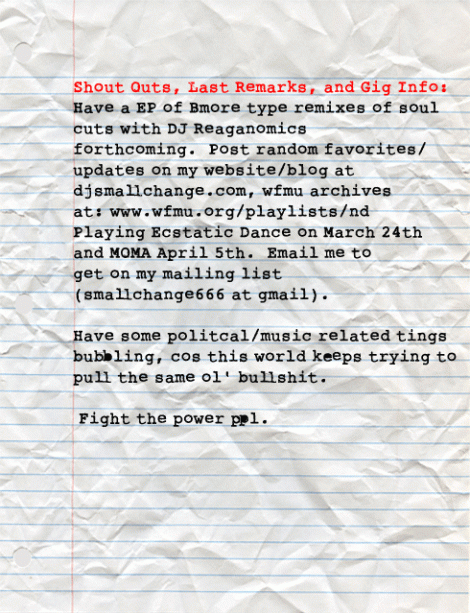 This week’s Big Ups gives us one of NYC’s most well known DJs, $mall ¢hange. Here is a guy who has an extensive knowledge of just about every genre of music, and finds a way to slip it in his sets, radio shows, etc. One of the hardest working DJs around, you can find Small Chizzy in the five boroughs of NYC, tearing it up at Burning Man, holding down Miami and a plethora of international gigs, on the radio at WFMU or East Village Radio, or just plain waxing fools about politics and world affairs. We’re very excited to have him in this week’s Big Ups.