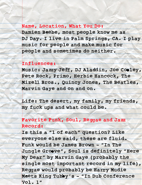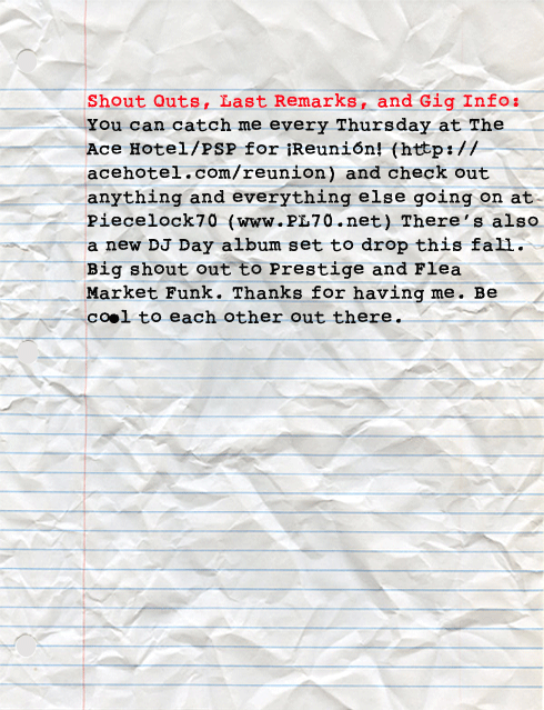 DJ Day has been making real beats, DJing, and producing out of Palm Springs, CA his whole life. His ¡Reunión! party is legendary, and if you aren’t familiar with him as a DJ or producer, I’d suggest you get familiar. Championed by legends DJ Jazzy Jeff and Gilles Peterson, plus working with artists like PUTS, Aloe Blacc, Quantic and Alice Russell among others, Day has been doing it and doing it well for more than a minute. What I always liked about Day is that his music could take me back to the Golden Age of Hip Hop, when music mattered, and it was actually good. His music does that to a person. Few artists do that today (no disrespect to those who are doing it right, you know who you are), and can make tracks like DJ Day does. I’m happy to have DJ Day in this week’s installment of Big Ups. Enjoy.