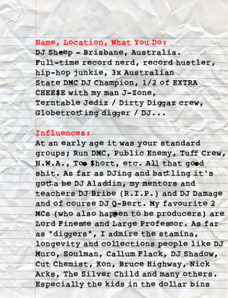 This week’s Big Ups comes to us by way of Australia. DJ Sheep, 3 time DMC champ and heavy digger has been at it for over 16 years. Holding down Brisbane as well as spots world wide, Sheep has been steady digging for records in the four corners of the earth and everywhere in between. Half of EXTRA CHEE$E with Big Ups alum J-Zone and a member of the Terntable Jediz / Dirty Diggaz crew, DJ Sheep is up there with the top diggers in the world. We’re honored to have him in this week’s Big Ups.