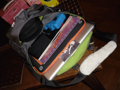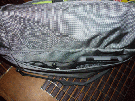Let’s start at the top with the optional leather shoulder pad (which I highly recommend). Records and gear are heavy, and you need a strap that doesn’t kill your shoulder. It’s padded with a faux sheep’s wool (like the Marlboro man jacket collar), and is quite comfortable. With two large, divided inside pockets, I was able to put my laptop with a protective sleeve, Serato vinyl, slip mats, a Serato box, extra vinyl, RCA’s and USB cords, my headphone case, and a Shure needle case between the two. I filled the the back zipper pocket with business cards and extra adapters. The front compartment has two unzipped pockets for a flashlight, pens, etc. The outside pockets on the side were perfect for my point and shoot camera, while the back slip pocket help my phone, Kindle Fire, and MP3 player and ear bud headphone case with no problem.