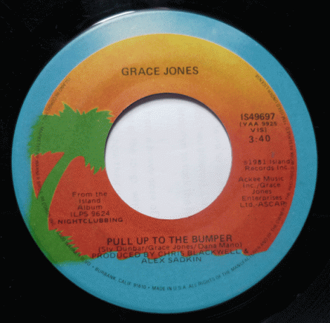 As records go, there are always surprises right around the corner. In NYC, you never know where records are going to turn up. Sometimes they turn up in a suitcase on the corner of the Avenue, other times they are sold out of a car boot like it was a cold day at the Camden lock up. This time, however, I found some records on the way to pick up my son from Summer Camp. As I walked by I saw some interesting stuff. Usually all these cats have the same stuff: Patti Smith, Bob Dylan, Talking Heads, and Blondie records. Nothing wrong with that. The last Highway 61 Revisited Lp I saw had writing from the guys childhood on the back in crayon: “Penelope sells girdles” in orange. This cat, who turned out to be really cool had an R.Crumb Lp displayed prominently, as well as old baseball cards, magazines, books. mirrors, power tools, and 3 boxes of 45s. The first box I dug into was every The Who 45 there was. A boom if you were a Classic Rock guy, but a bust if you weren’t. When I finally got through to the unsleeved stuff, what do I pull out? A James Brown The Payback 45 and this record right here: Grace Jones “Pull Up To The Bumper” on Island Records from 1981. Now I don’t like to be fickle, but my Funk comes from approximately 1967 to 1974. How could I not pick this up for a quarter, and why wouldn’t I review this dance floor classic?