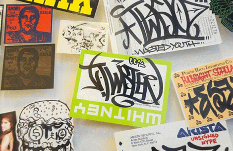 Along with Hip Hop and all kinds of music and the many people involved with the movement through the years, stickers have become a huge part of that culture and culture in general. Graffiti artists, street artists and the like have been putting up personalized stickers for decades. From the humble beginnings of the political bumper sticker that exploded during the 1940’s to today’s over saturation of guerilla marketing on every corner, the sticker has a place in society. DJs, bands, artists, or people who just wanted to stand out in the crowd have put up a sticker in the most visible places. Before Shepard Fairy took over with OBEY Giant stickers, artists like Keith Haring and Andy Warhol were making and distributing their art via the sticker. Many legendary kings of the street were throwing up customized postal labels, Hello My Name is labels (Jest had one of the best: WHO the fuck is jest), and a myriad of other types of messages that have become a normal part of the urban landscape to those who live in a major city. Now, the sticker has finally become legitimized. Collected by many people (including this writer), the art of the sticker has gone from street, to photographs, to books, and now to the museum walls (unstuck that is).