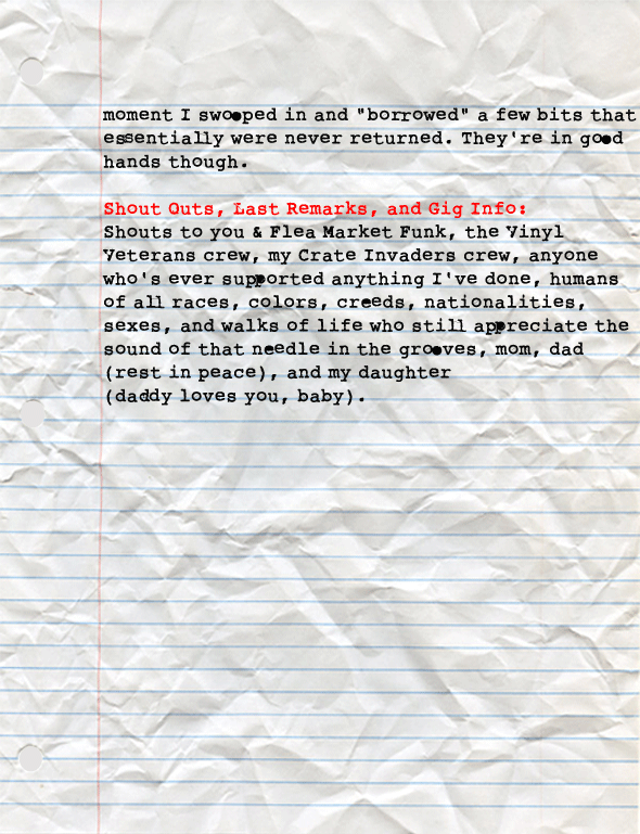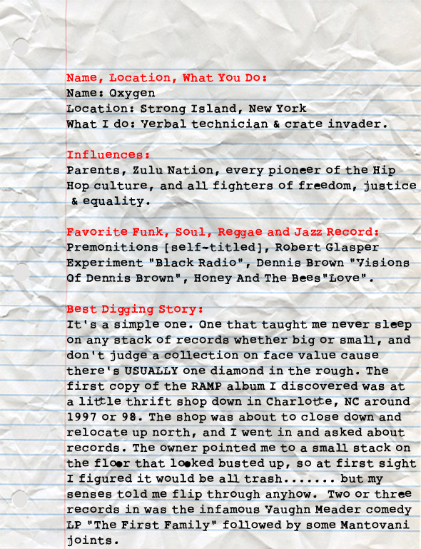 This week we have a little something special. The latest feature focuses on Strong Island’s Oxygen, aka Ox the Architect. Part of the Soundsci crew, solo artist, crate digger, DJ, member of the Crate Invaders and Vinyl Veterans, SPOX PhD (with DJ Spinna) and all around talented cat, Oxygen has been dropping heat for more than a minute. When not getting down and dirty in the crates, pulling out those rare gems, he’s got the pen in hand, writing some of the dopest lyrics around. The man lives and breathes Hip Hop culture. With a huge nod to the old school in every way, you can tell from the sound and sights of Ox that he is Hip Hop to the core. They always say like minded individuals gravitate towards each other, and I believe it to be true. Oxygen is the real deal, and I’m proud to have a guy doing his own thing the right way this week in Big Ups. If more up and coming emcees would take a cue from Ox, there would be a lot better music going on int his world. I’ve said it before and I’ll say it again, you must learn.