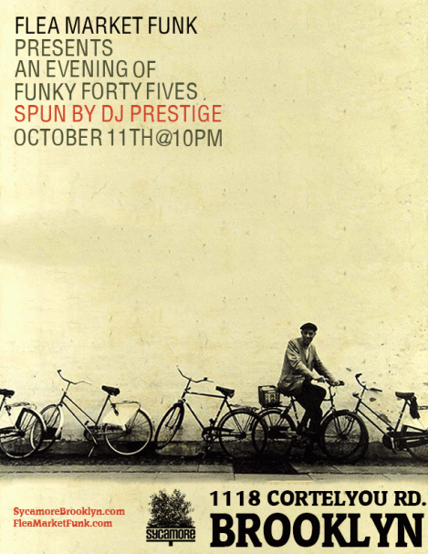 Starting in October, Flea Market Funk will be teaming up with Sycamore in Ditmas Park, Brooklyn for a night of Funk and Soul vinyl. The most diverse neighborhood in Kings County is home to one of the most unique music spaces to pop up. Part bar, part flower shop and all parts awesome, Sycamore hosts some great artists and DJs, including Monk-One and Eric from NYC Trust and Slim Hug among others who have all been holding down all vinyl nights at the venue. Starting October 11th, and every second Friday of each month, Flea Market Funk will host a night of funky forty fives. Running the gamut from deep Funk, raw Soul, and real Reggae, expect a sprinkling of Jazz and Latin 7″s to be thrown in as well. We’ll see how it goes, but hopefully we will be able to get a few guest selectors in this intimate space. Sycamore is the only space in its area to host DJs, and they’ve made the decision to keep it all organic and analog with DJs spinning vinyl. The previous gigs I’ve done there have been really great, so I expect more good vibes as this new night gets under way. More info as it comes in.
