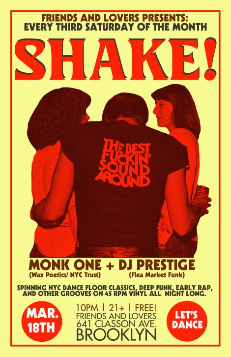 Tomorrow night in the borough of Brooklyn in NYC, we celebrate a night of good people, good music, and the records that make you shake. Eight months old already, the Shake! party (DJ Prestige x Monk One) gives you classic NYC dance vibes from start to finish. Deep funk, proto disco, disco, early rap and many other classics are spun on 45 rpm vinyl all night. From old club heads, to B-Boy crews, to dancers to people who just want to have a night of no stress in a safe environment, there is room for everyone at this party. Summoning the spirits of places like The Loft, The Paradise Garage, and The Roxy among others, both DJs dig deep in their forty five crates to bring some of the best music for crowds to move to. This month, we have the G Man back on the mic, who will help you navigate your way through this journey into sound.
