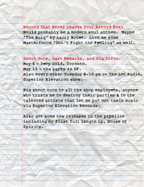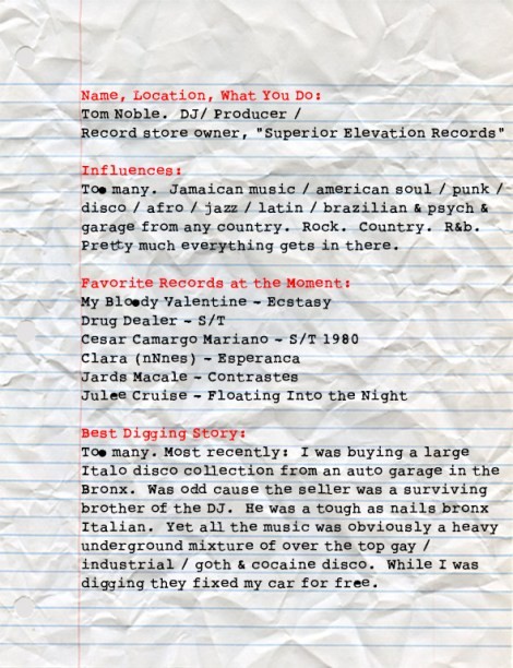 Tom Noble. The name rings synonymous with good music. DJ/ producer/ record dealer and record store owner, wherever he has been, good music is sure to follow. Lotus Land Records, Superior Elevation Records, and others, Disco Tom Noble has been doing it and doing it well for years. If you have no idea what I am talking about, just listen to the House of Spirits 12″ “Holding On”, a record that is as close to perfection as you can get. The man knows his music and knows how to make music, proper dance floor music, that gets them moving. He sat down with us and got the Big Ups treatment. So without any further delay, here is the man himself, Tom Noble. respect. Enjoy!