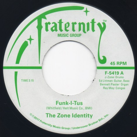 nce the early days of FMF. One such artist who has reinvented himself is J-Zone. The former rapper turned drummer has turned his career around and has been putting out projects non-stop the last few years. After much success with The Du-Rites with Pablo Martin, his latest project, The Zone Identity sees the producer and multi-instrumentalist getting plenty of stank on two exceptional funk tunes. For this journey he linked up with jazz guitarist Ed Littman and Hammond B-3 organist Bennett Paster from Fraternity Music Group house band, The U.B.’s. He also utilized his designated hitter, percussionist Ray May for this project, while he hits the skins and splits bass duties with Littman as well. For those of you that know Mr. Mumford, he’s got a soft spot for funk 45s and with this debut 7″ from The Zone Identity, he’s picked two that are definitely most funky. The band proceeds to put their own spin on far out there late ’60’s Los Angeles troop Warm Excursion’s “Funk-I-Tus”, a $100 plus forty five that is greasy as hell. Their take is a hard drum hitting, funky organ jam that you will not want to stop playing. Seriously. On the flip they pay homage to J-Zone’s favorite band, Kool and the Gang (Jersey City stand up!) with a bang up version of “Let The Music Take Your Mind”. Their version is a mix between the original and Grant Green’s cover recorded at The Cliche Lounge in Newark, NJ in 1970. Both sides of this record definitely sound like they were recorded in 1970, and for that, we tip our hat to this debut on Fraternity Music Group. Today is the first day it is available and we are already anxiously awaiting the sophomore 45. Another winner for J-Zone.