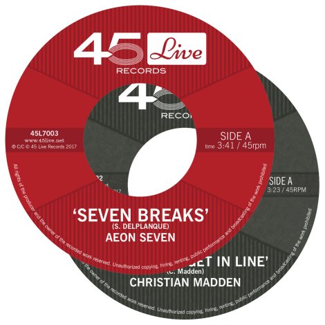 The latest 45 Live double pack of seven inch records welcomes the talented Christian Madden to the 45 Live family. Formerly of the band The Earlies, who mixed British folk and psychedelia in with many other influences, he joins forces with the powerhouse Aeon Seven on this pack of two heaters for your record box. Both of Madden’s tracks are definitely tracks you could spin out, with the A-side, “Everybody Get In Line” mixing some Northern Soul with jazz rock and the result is beautiful. Lots of Hammond in this mid tempo rocker, which sticks out brilliantly in this eleven piece outfit making the music. The flip, “Eating It All” is some tough jazz fusion with great drum work and horns for days. Channeling the masters such as Brian Auger, George Duke, and Colosseum, this is a must have 45. And for the adventurous DJ, try dropping it on the dance floor. It could definitely work. Another newcomer to the label, but not a newcomer to the record game, is France’s Aeon Seven, who puts out a shout to all the B Boys in the house with ‘Seven Breaks”. This is ordering all you top rockers and floor sweepers to get on the floor and start the show. Hard funk breaks, more organ than you can handle and commanding drum breaks level off this call to arms (and legs) so you can wiggle waggle and make it move until the break of dawn. The flip is the instrumental, which gives you some room as a DJ to do your own cutting, work doubles, and generally just beat this tune up for your audience. Two totally different sounding, but tough indeed records in this pack. 45 Live for the win again and again. Stream both below and buy it at the next link as well.