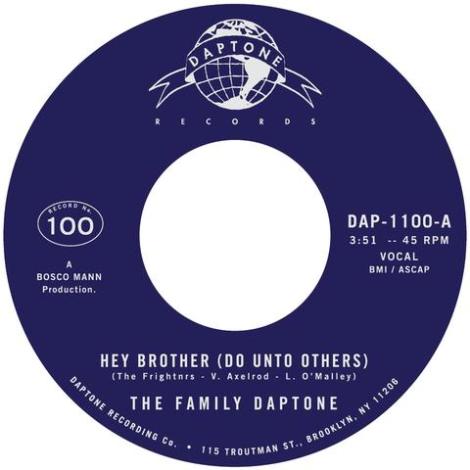 If there is one record label that has been consistent the whole twelve years I’ve had Flea Market Funk, it’s been Daptone Records. Before I was writing about modern day funk and soul, they were plugging along putting out records by Sharon Jones (among others) and making their mark in music history. So it is with great pleasure that I let you know that Daptone Records is on number 100 of their forty five releases. That’s a century of seven inch singles, and they are celebrating it in a way that they could only do. The label has seen triumph and tragedy, but through it all has pulled themselves up to march on and be one of the most influential funk and soul record labels of our lifetime. This release, Family Daptone’s “Hey Brother (Do Unto Others)” b/w “Soul Fugue” is a collaboration of the label’s legendary talent. “Hey Brother” a track by The Frightnrs (originally off of Nothing More To Say), pays tribute to lead singer Dan Klein, who passed tragically before the record was even released. Featuring Saun & Starr, The Frightnrs, Naomi Shelton, James Hunter, Lee Fields, Duke Amayo, plus the late monarchs of Charles Bradley and Sharon Jones all performing side by side over a groove from members of Menahan Street Band and The Dap Kings. The B-Side, “Soul Fugue” features an orchestra of Bosco Mann, Dave Guy, Homer Steinweiss, Ian Hendrickson-Smith, Brian Wolfe, along with current and past members of the Dap Kings, Menahan Street Band, Antibalas, The Soul Providers, The Daktaris, and The Extraordinaires who recorded this epic, gargantuan track on, get this, February 29th, 2016. If that wasn’t a sign (leap year and all), we don’t know what it.