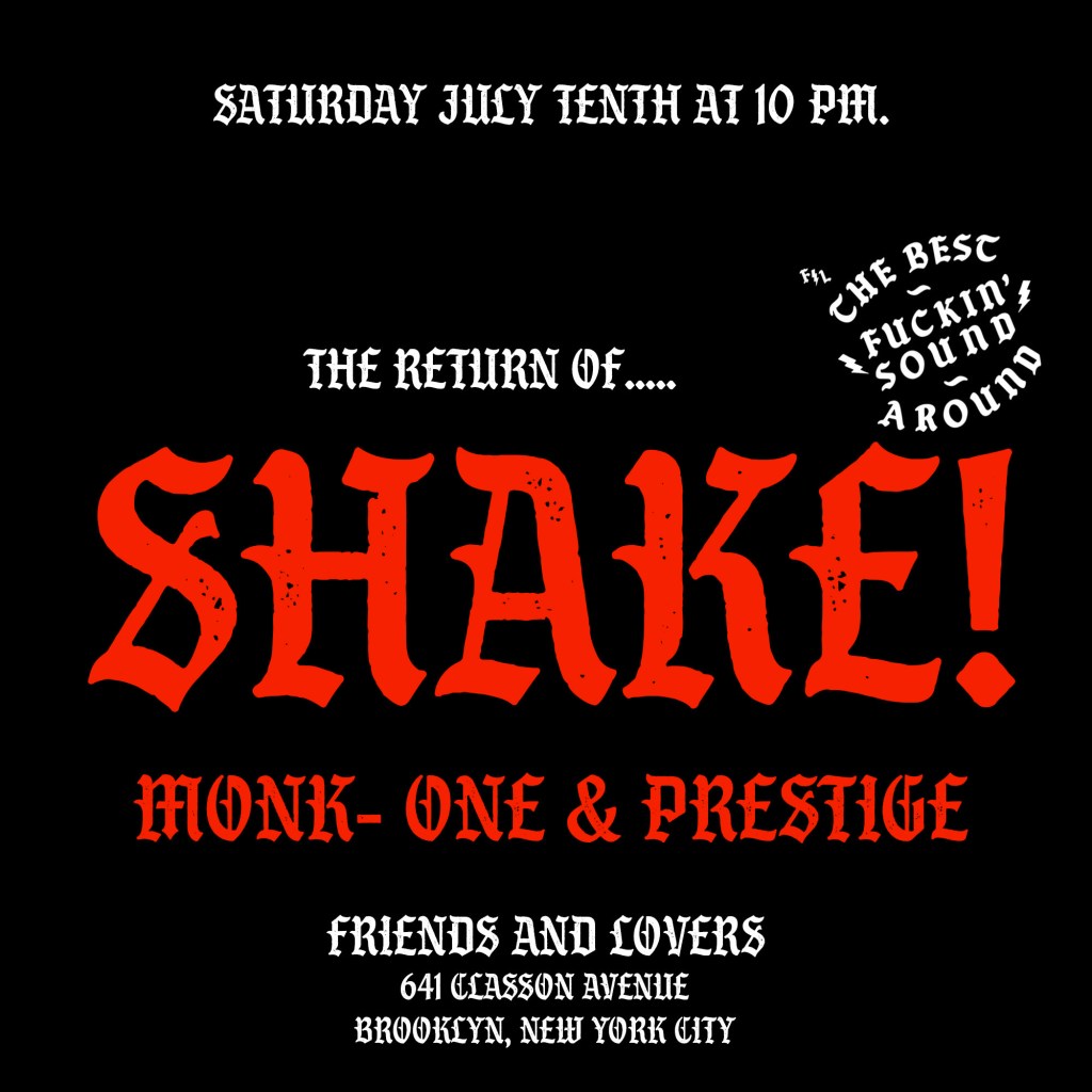 Mark your calendars, the return of Shake! Brooklyn is here. It’s been a minute and we’re excited to rock with y’all in BR double O K- LYN the planet. Myself and Monk-Uno will be laying down the best fuckin’ sound around, the Shake! sound, all on 45 RPM on July 10th at 10 PM. Dancing recommended.