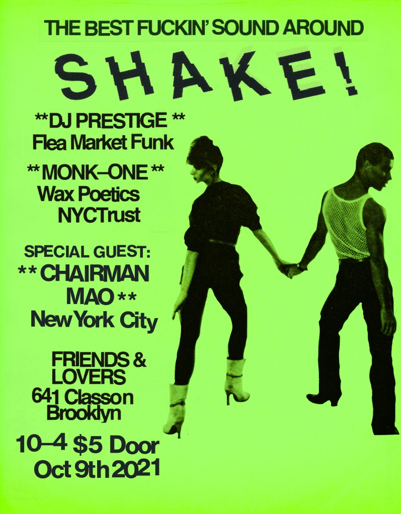 This Saturday night, October 9th, enjoy another Shake! Brooklyn party at Friends and Lovers in Crown Heights, Brooklyn, NYC. Residents Monk-One, Prestige and special guest: Chairman Mao will be laying down an all dance floor affair spinning NYC dance classics, funk, house and other funky delicacies to keep you moving all night long. This party is five years strong and ain’t no stopping us now. Here are the details: