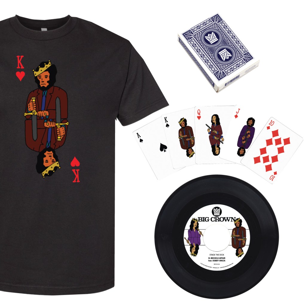 The record in this bundle is another collabo, El Michels Affair and Bobby Oroza teaming up for a heavy forty-five. The A is “Stack The Deck” which runs along with this collaboration bundle card deck theme and gambling on love. Top-notch stuff. The B-Side sees El Michels covering Biggie on their special, grit-filled version of “Things Done Changed”. For us, this seven-inch would have been enough, but BCR push it up further. This bunch features a collector’s item: a limited edition tee (in black, white, or yellow) and a 52 card poker deck (2 jokes, 2 logos) in a customized box designed by El Oms. Limited to 500 pieces worldwide, this thing is a great gift for the holidays on many levels. It’ll keep giving on so many levels. BCR just keeps innovating and this one is sweet all around. Who’s in for playing cards and listening to records on a Saturday night? Hit us up!